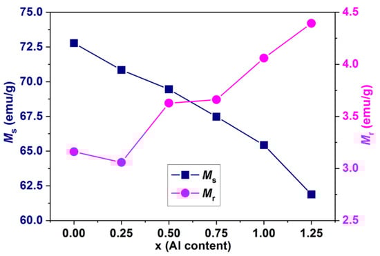Figure 8 illustrates the effects of the Al content (x) on the saturation magnetization (Ms) and remanent magnetization (Mr) for the W-type SrYb hexaferrite Sr0.85Yb0.15Zn1.5Co0.5AlxFe16−xO27. As can be seen from Figure 8, the value of Ms gradually decreased from 72.779 emu/g at x = 0.00 to 61.882 emu/g at x = 1.25. Additionally, Mr slightly decreased from 3.161 emu/g at x = 0.00 to 3.058 emu/g at x = 0.25 and increased by degrees as the Al content (x) increased from 0.25 to 1.25. This changing trend of Ms is basically consistent with that of BaCo2Fe16−xAlxO27 synthesized using the traditional sol–gel method, which was studied by Ahmad et al. []. In the unit cell of a W-type hexaferrite that is composed of two hexagonal blocks (R block) and four spinel blocks (S block), there are seven kinds of crystal sites, detailed as follows: one trigonal bipyramidal site (2d), two tetrahedral sites (4 e and 4 fIV), and four octahedral sites (12 k, 4 fVI, 4 f, and 6 g) []. In W-type hexaferrites, the spin directions of the 12 k, 4 f, 6 g, and 2 d sublattices are spin-up, whereas the spin directions of the 4 e, 4 fVI, and 4 fIV sublattices are spin-down, with the nearest cations coupled via superexchange interactions through the O2− ions []. The total magnetic moment (i.e., 27.4 μB) of W-type hexaferrites is due to their uncompensated upward spins []. Thus, the magnetic properties of W-type hexaferrites can be affected by the occupation of their sites by different cations [,,]. The magnetic moments of Fe3+ and Al3+ ions are 5.0 μB and about 0.0 μB, respectively [,]. As the Al content (x) increased from 0.00 to 1.25, Ms decreased, which is attributed to the following factor: Albanese et al. studied the Al-substituted Zn2-W hexaferrites and Al-substituted M-type Ba hexaferrites and found that Al3+ ions preferentially enter into the octahedral sites 2 a and 12 k [,]. The nonmagnetic Al3+ ions having a magnetic moment of 0.0 μB, which is less than that of Fe3+ ion (5.0 μB), replace the iron ions from the sites having spins in an upward direction, and this results in a decrease in the total magnetic moment. Therefore, the values of the saturation magnetization (Ms) decrease in the Al-substituted W-type SrYb hexaferrites.