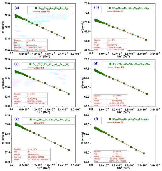 Plots of magnetization (M) versus 1/H2 for the W-type SrYb hexaferrite Sr0.85Yb0.15Zn1.5Co0.5AlxFe16−xO27 with Al content (x) of (a) x = 0.00, (b) x = 0.25, (c) x = 0.50, (d) x = 0.75, (e) x = 1.00, and (f) x = 1.25.
