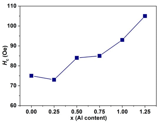 Figure 12 depicts the influence of the Al content (x) on the coercivity (Hc) of the W-type SrYb hexaferrite Sr0.85Yb0.15Zn1.5Co0.5AlxFe16−xO27. As seen from Figure 12, with the increase in the Al content (x), the value of Hc slightly decreased from 75 Oe at x = 0.00 to 73 Oe at x = 0.25 and then gradually increased from 73 Oe at x = 0.25 to 105 Oe at x = 1.25. All the samples had Hc values ranging from 70 Oe to 110 Oe. This low coercivity makes them ideal for microwave equipment, safety, switching, and sensing applications []. The trend in Hc is not in agreement with that of BaCo2Fe16−xAlxO27, which was studied by Ahmad et al. []. However, the Hc values in this study are slightly lower than those reported by Ahmad et al. []. The main reason is that the preparation method used in this study is different from that of the previous study []. The coercivity mechanism hinges on the internal and external properties of the material. The intrinsic properties of the material are related to its crystal structure and chemical composition, such as Ms, Tc, anisotropic energy Ek, and anisotropic field Ha. The external properties of the material are related to its microstructures, such as defects, grain size, and grain shape. In theory, the coercivity (Hc) of the particle assembly can be expressed in the following formula []: