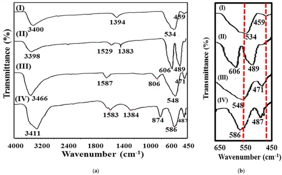 FT-IR spectra of pure and doped ferrite NPs depicted broad bands in the range of 3398–3466 cm−1 (Figure 2(aI)) that were ascribed to O-H stretching vibrations of adsorbed H2O molecules. The presence of prominent absorption bands in the region of 459–489 cm−1 (Figure 2a,b) was attributed to metal–oxygen octahedral stretching modes, whereas the bands ranging between 534 cm−1 and 606 cm−1 matched to the tetrahedral M-O bond vibrations. The FT-IR spectra of the Ti4+-doped SrFe2O4 (Figure 2a (III and IV)) contained all the absorption bands of pristine SrFe2O4 NPs, but the positions of the bands corresponding to the M-O stretching vibrations (where M = Sr2+, Ti4+ and Fe3+) were shifted toward a higher-frequency region (Figure 2b) with the additional bands at 803 and 874 cm−1 attributed to the O-Fe-O vibrations (Figure 2a). The shifting of the bands represented the change in the occupancy of the lattice sites by the smaller Ti4+ ions in the spinel lattice structure. The perturbation caused by the substitution of a smaller dopant ion led to reduced mass and increased force constant values. All these parameters favored the blue shift of M-O bands to a higher-frequency region.