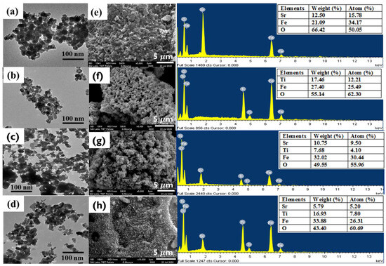 TEM and SEM-EDS images of (a,e) SrFe2O4, (b,f) TiFe2O5, (c,g) Sr0.7Ti0.3Fe2O4.3 and (d,h) Sr0.4Ti0.6Fe2O4.6..