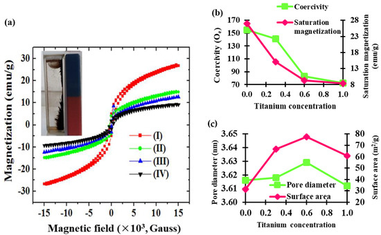 The decrease in the lattice parameter can be described using Vegard’s law, as the smaller radius of the dopant ion compared to the replacing ion favored lattice shrinkage and the lattice constant (a) decreased. The observed decrease in the lattice constant with increased Ti4+ content suggested the substitution (Figure S1). These findings are in good agreement with the results reported by Amaliya et al. [36] and Rao et al. [37] for Ti4+-doped cobalt ferrite.