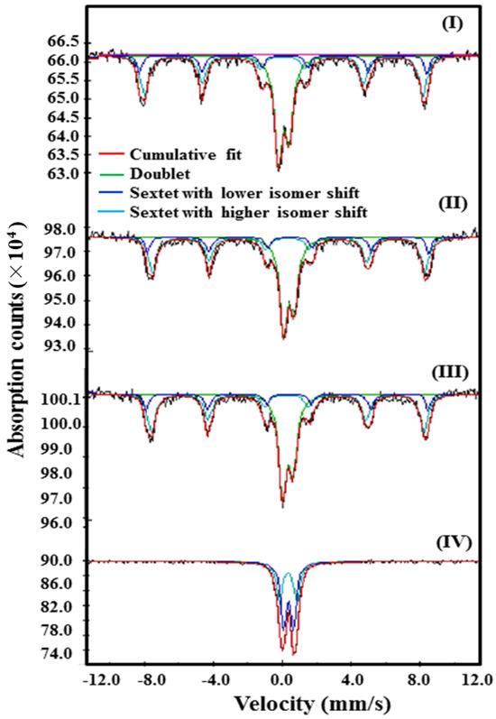 The VSM plots (Figure 4a) displayed s-shaped hysteresis loops for synthesized ferrite NPs. The obtained magnetic parameters, viz. saturation magnetization (Ms), retentivity (Mr) and coercivity (Hc), are tabulated in Table 2. The Ms values are concerned with antiparallel magnetic interactions amongst the magnetic moments of cations existing at the Oh and Td sites. The magnetic properties of SrFe2O4 being a mixed spinel ferrite are based on the site occupancy of different cations in its lattice structure. SrFe2O4 NPs had the highest Ms value (27.0 emu/g), revealing its promising magnetic properties, while TiFe2O5 had the lowest Ms value. In the case of Sr1−xTixFe2O4+δ (x = 0.3 and 0.6), the magnetic moment decreased from 15.1 to 9.3 with an increase in the content of non-magnetic Ti4+ ions. This result might be attributed to the presence of a TiFe2O5 phase in doped samples and to the insertion of non-magnetic Ti4+ ions in SrFe2O4+δ, which reduced its ferrimagnetism and resulted in the decrease in the Ms value (Figure 4b). To ascertain the phase purity, we performed Mossbauer studies on pure and doped strontium ferrite. The Mossbauer results clearly demonstrated that doped ferrite had only a single phase as it displayed two sextets for the octahedral and tetrahedral sites of the spinel ferrite structure.