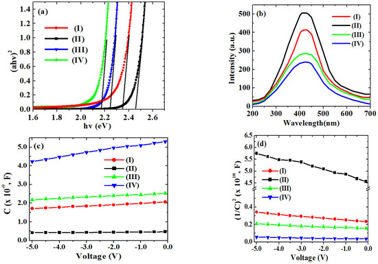(a) Tauc plot and (b) photoluminescence spectra, (c) capacitance–voltage diagram and (d) (1/Capacitance)2 versus reverse-bias voltage of (I) SrFe2O4, (II) TiFe2O5, (III) Sr0.7Ti0.3Fe2O4.3 and (IV) Sr0.4Ti0.6Fe2O4.6 NPs.