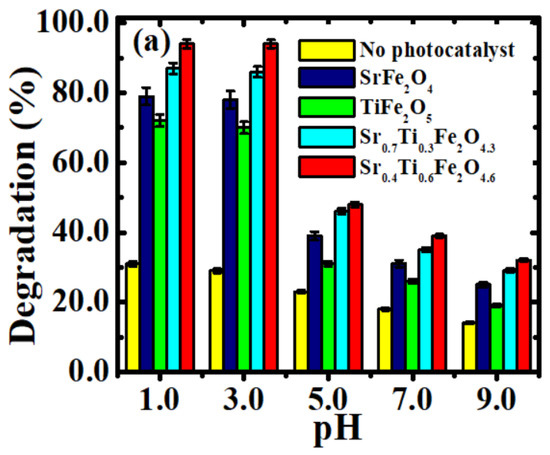 where A = energy-dependent constant, α = absorption constant, hν = incident energy of photon, Eg = band gap energy and n depends on the nature of electronic transition and is 0.5 and 2.0 for indirect and direct Eg, respectively [46,47]. The direct Eg is based on the assumption of direct transition between the edges of VB and CB. In the present study, the ferrite NPs showed a linear plot in the graph of (αhν)2 vs. hν. So, the direct Eg values were evaluated by extrapolating the linear part of the curve. TiFe2O5 NPs revealed the highest Eg with a value of 2.45 eV, whereas the pristine SrFe2O4 NPs displayed an Eg of 2.34 eV (Figure 7a). Among the Ti4+ substituted ferrite NPs, the Sr0.4Ti0.6Fe2O4+δ NPs with high Ti4+ content showed greater reduction in Eg from 2.34 to 2.18 eV. The narrowing of Eg values can be ascribed to the defects produced by the introduction of Ti4+ dopant ions, which led to the presence of new energy levels between VB and CB. The reduction in band gap is consistent to the observations reported by Singh et al. [31] for Ti4+-doped magnesium ferrite NPs. However, the lower obtained band gap in the present study may be due to the electron confinement effect that resulted in the more feasible transfer of electrons to the CB from VB in Sr0.4Ti0.6Fe2O4.6. Thus, the reduction in band gap on Ti4+ substitution in SrFe2O4 resulted in an enhanced photocatalytic potential for their application in the degradation of organic contaminants under visible-light illumination.