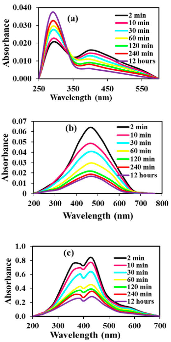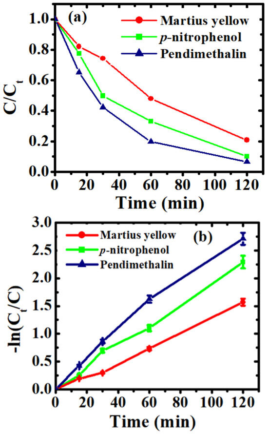 The photocatalytic potential of Sr0.4Ti0.6Fe2O4.6 NPs for p-nitrophenol, pendimethalin and Martius yellow was studied under visible-light illumination. The temporal UV–visible spectra of nitroaromatic pollutants are illustrated in Figure 9a–c. With the progress of the reaction, the absorption maxima for the pollutants decreased, signifying their degradation. The appearance of a new peak at 290 nm in the case of p-nitrophenol further supported its degradation caused by the formation of hydroquinones [59,60]. The decolorization of the solution might be caused by the result of de-nitration of the chromophoric ring, thus revealing the change in the molecular configuration.