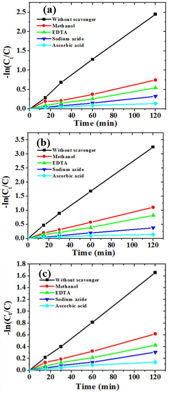 The photodegradation mechanism of nitroaromatic pollutants using Sr0.4Ti0.6Fe2O4.6 NPs was examined by applying specific reactive oxygen species quenching agents in the solutions comprising the nitroaromatic solution and Sr0.4Ti0.6Fe2O4.6 NPs. The Langmuir–Hinshelwood studies of photodegradation of nitroaromatic pollutants in the presence of methanol, ethylene diamine tetraacetate (EDTA), sodium azide and ascorbic acid are shown in Figure 11a–c. The rate of inhibition of photodegradation of the studied nitroaromatic compounds for the batch treated with ascorbic acid was significantly more. It indicated that the generation of superoxide anion radicals (O2•−) was significant for Sr0.4Ti0.6Fe2O4.6 NPs. Singlet oxygen species (O21) are generated because of the reaction of holes with O2•− [62]. In the batch treated with an addition of sodium azide, EDTA and methanol, the modest inhibition of the photodegradation rate was also observed. It implied that O21, h+ and •OH radicals also had the effect in the photocatalytical degradation of nitroaromatic compounds. The decreased inhibition in the dye degradation rate was also reported using sodium azide as a scavenging agent using Se-doped ZnS NPs by Talukdar et al. [63]. The role of reactive oxygen species in the photodegradation process was observed to be in following order: