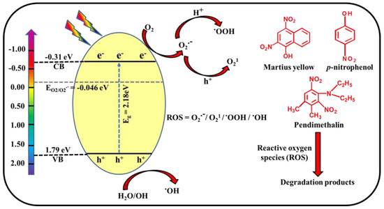 The electronegativity value for Sr0.4Ti0.6Fe2O4.6 was calculated to be 5.23 eV. The determined EVB and ECB for Sr0.4Ti0.6Fe2O4.6 NPs were −0.31 eV and +1.79 eV, respectively, as given in Figure 9e. The EVB of Sr0.4Ti0.6Fe2O4.6 is 1.79 eV vs. NHE, which is less than the E (–OH/•OH) redox potential (1.99 eV vs. NHE) [17]. Therefore, valence h+ created in Sr0.4Ti0.6Fe2O4.6 cannot interact with H2O or −OH to generate highly reactive oxygen species (•OH). However, the ECB of Sr0.4Ti0.6Fe2O4.6 is—0.31 eV vs. NHE, respectively, which is more than the E (O2/O2•−) redox potential (−0.046 eV vs. NHE) [65,66] to reduce O2 to O2•−. These O2•− can capture H2O to further form •OH radicals [55,65]. The reactive oxygen species, viz. O2•− and •OH, thus formed are capable of oxidizing nitroaromatic pollutants and mineralizing them. The low band gap (2.18 eV) of Sr0.4Ti0.6Fe2O4.6 NPs facilitated the electron excitation when exposed to visible light (Equation (6)) (Figure 12). The narrowing of the band gap might be because of the intrinsic energy levels with the substitution of Ti4+ in SrFe2O4. The accumulation of photo-generated electrons increased on the CB and photocatalytic active sites were generated on the photocatalyst’s surface. The holes (h+) reacted with the H2O molecules from the reaction medium to form •OH (Equation (7)). The photo-induced electrons (e−), on reacting with dissolved O2, get transformed into O2•− (Equation (8)). The O2•−, on reacting with H+ ions, generates peroxyl radicals (•OOH) (Equation (9)). O2•− on reaction with holes could generate singlet oxygen species (O21) (Equation (10)). The OOH radicals consequently decompose to produce the •OH and O2•− radicals (Equations (11)–(13)). These reactive oxygen species could target the nitroaromatic pollutants and mineralize them into degraded products (Equation (14)).