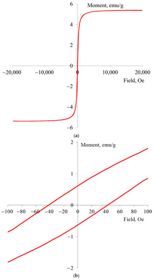 The study of the magnetization reversal curves of the MLPSICG lyophilizate made it possible to determine a saturation magnetization equal to 5.36 emu/g (Figure 3a). This value for magnetic fluids is 10–12 emu/g [36], which makes it possible to predict the accumulation of MLPSICG in the area of magnetic field action. The plot of the dependence of the magnetic moment on the field strength in the zone of low field values shows a coercive force equal to 40 oersteds (Figure 3b). According to Bertotti (1998) [37], liposomes are soft magnetic materials with a relatively low coercive force. After the magnetic liposomes burst due to unprotected drying, whatever properties are measured are not those of liposomes, but rather the properties of the fragments and spilled contents.