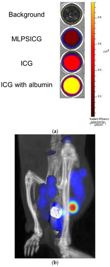 To explore the possibility of using MLPSICG for fluorescence imaging, preliminary in vitro studies were performed (Figure 5a). The strongest fluorescent signal was registered in the ICG + human albumin sample, which may be attributed to the previously described augmentation of fluorescent properties of ICG by albumin [47]. The latter effect is also relevant to the in vivo fluorescent imaging with ICG. Supporting these findings, the ICG sample without albumin demonstrated a lower fluorescence intensity than ICG + albumin. MLPSICG were characterized by slightly lower fluorescence levels compared with the free ICG solution, probably due to the shielding effect of the lipid membrane and the absorption of secondary radiation by MNPs. The MNP suspension and blank samples produced near-zero fluorescence. In this pilot experiment, MLPSICG demonstrated potent fluorescent properties, which enabled us to draw a conclusion about their suitability for in vivo fluorescent imaging.