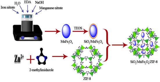 The synthesis scheme of SiO2/MnFe2O4/ZIF-8 nanocomposite. (TEOS: Tetraethyl orthosilicate).