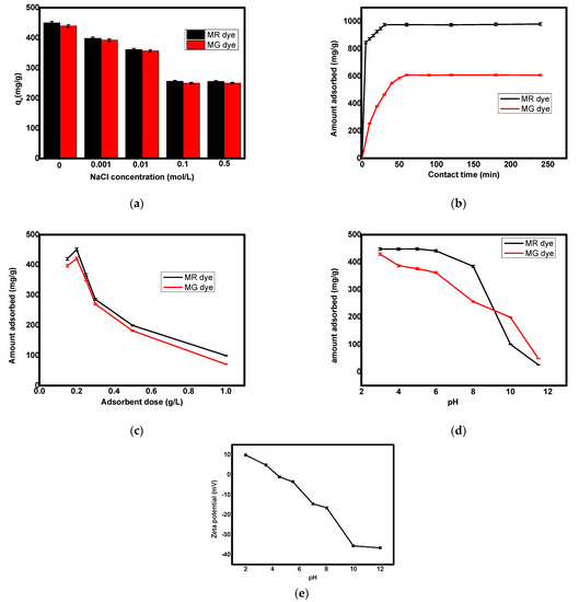 To determine the optimum conditions for the removal of MR and MG dyes on the surface of the SiO2/MnFe2O4/ZIF-8 nanocomposite, the effects of different parameters including ionic strength, contact time, adsorbent dose, and pH were studied as shown in Figure 5. The effect of ionic strength on the removal of MR and MG dyes was studied using different NaCl concentrations ranging from 1 × 10−3 to 0.5 mol/L, as shown in Figure 5a. With a contact time of 60.0 min for the MG dye and 30.0 min for the MR dye, a stirring speed of 240 rpm at 25.0 °C, an initial dye concentration of 100 ppm, and an adsorbent dose of 0.2 g/L, the influence of ionic strength on adsorption was investigated. According to Figure 5a, the adsorption capacity of MR and MG dyes was decreased by increasing the concentration of sodium chloride. This decrease in adsorption capacity associated with the increase in ionic strength is attributed to the decrease in electrostatic attraction between adsorbent and adsorbate. Additionally, the adsorbent molecules were agglomerated by increasing the ionic strength, causing a decrease in the number of adsorption sites [65]. In addition to this electrostatic influence, the salt ions could compete with the adsorbate ions for the adsorption sites, leading to the weakening of dye adsorption. The second studied parameter that affected the adsorption was the contact time. The adsorption of MR and MG dyes on the surface of the SiO2/MnFe2O4/ZIF-8 nanocomposite was determined at a time ranging from 0 to 250 min, as shown in Figure 5b. According to Figure 5b, the adsorption capacity was increased up to 60 min for MG dye and 30 min for MR dye, and over this time, the adsorption capacity did not change. This increase in the adsorption capacity in the first stage was attributed to the availability of adsorption sites, until equilibrium was reached [66]. After that, there were unavailable adsorption sites to adsorb more ions of the dye due to the occupation of all adsorption sites causing no increase in the adsorption [67]. Subsequently, the optimum contact time was 60 min for MG dye and 30 min for MR dye, after which the adsorption became constant, revealing the saturation of active sites on the adsorbent surface.