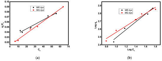 The mechanism of the adsorption process can be analyzed using isotherm studies [70,71]. In the current study, the adsorption of MG and MR dyes on the surface of the SiO2/MnFe2O4/ZIF-8 nanocomposite was evaluated using the two familiar adsorption models, Langmuir and Freundlich. The linear equations of Langmuir and Freundlich models are presented as shown in Equations (2) and (3), respectively.