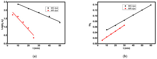 The fitting of experimental data to pseudo-first-order model (a) and pseudo-second-order (b) for the adsorption of MG and MR dyes on the surface of SiO2/MnFe2O4/ZIF-8 nanocomposite.