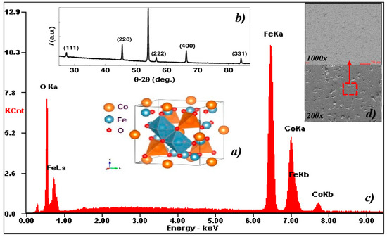 (a) Data of X-ray spectral microanalysis for the single-crystal CoFe2O4 at T = 295 K, (b) model of crystal lattice of ferrite spinel, (c) data of X-ray analysis in large angles (θ–2θ), (d) electron microscopy pattern of the crystal surface with a magnification of 200× and 1000× (red-selected area).