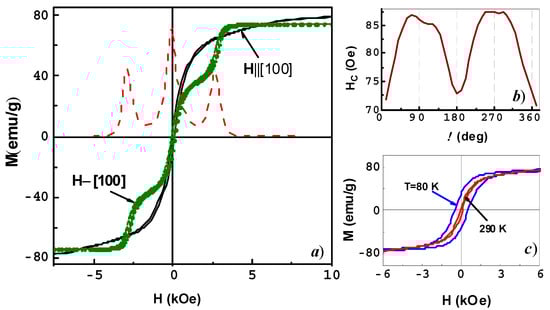 In Figure 2a, field dependences of magnetization M(H) at T = 295 K are shown for different field orientations relative to the crystallographic axes. At H||[100], where [100] is the easy-magnetization axis [13], the magnetization is saturated at H ≈ 3 kOe and a further paraprocess takes place, with a linear growth up to MS = 82 emu/g at H = 15 kOe. This magnetization value lies in close proximity to the data reported for single crystals and films of CoFe2O4 [11,13]. A similar dependence M(H) was also observed in the case of H⊥[100]. If the magnetic field is oriented at an angle φ = 45° to the axis [100], which matches to H||[110], the magnetization curve displays two steps. The extrema of the first derivative dM/dH at H ≈ 1.5 kOe and H ≈ 2.8 kOe (Figure 2) correspond to the appearance of the steps in M(H). The condition dM/dH = 0 fulfilled at H ≈ 3.9 kOe corresponds to the saturation state, with MS~78 emu/g. A step in M(H) at H||[111] was detected earlier in non-stoichiometric Co0.8Fe2.2O4 at the field H~70 kOe in [12]. This step was followed by a jump in magnetostriction and was ascribed to the anisotropy-driven transition caused by a rotation of the magnetization vector jumping over an energy barrier. In stoichiometric single crystals of CoFe2O4, the step is formed already in relatively small fields H~8 kOe [14]. In our experiments, the step was registered in H~1.5 kOe at room temperature and it was supposed to be caused by the distortions of the cubic symmetry of the CoFe2O4 crystal lattice at H||[110]. Indeed, the anisotropic energy for a cubic crystal can be written as: