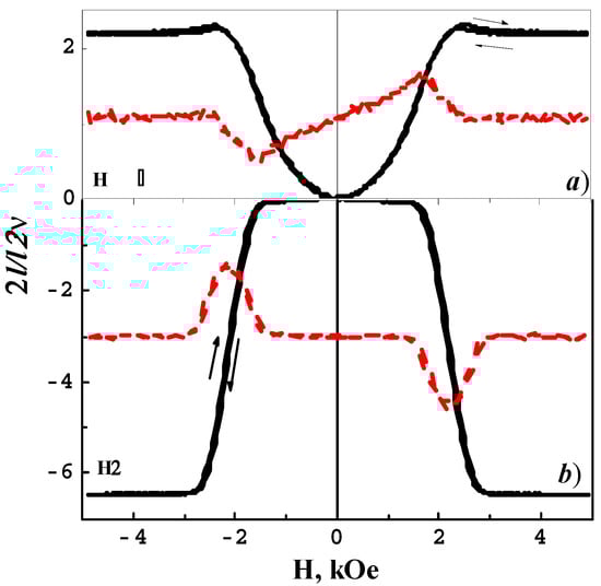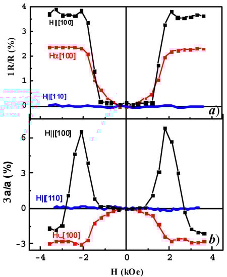 In the case of H⊥[100], a gradual growth of ΔR/R and Δα/α values was observed with an increasing field, starting from the zero point, which was similar to the behavior of Δl/l(H). The effects become saturated in the same fields as in the case of H||[100]. As aforementioned, at H⊥|[100] the magnetostriction should be twice as low as at H||[100] − (Δl/l)100 = −λ100/2. Correspondingly, the values of ΔR/R and Δα/α were saturated and approximately twice as low as in the case of H||[100] (Figure 8).