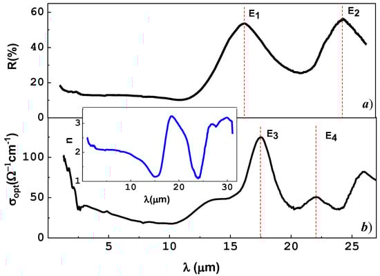 The band E1 with symmetry T1u arises due to Co–O ion oscillations in the octahedral sublattice [22], whereas E2(T1u) is predominantly related to the oxygen-ion oscillations in the tetrahedral sublattice [23]. The short-wave edges of the bands E1 и E2 were distorted by the contribution of weak additional bands. The room-temperature resistivity of the samples was about ~105 Ω∙cm, hence, free charge carriers do not contribute to the reflection spectrum. This fact helped to simplify the application of the Kramers–Kronig method for processing the spectra of optical conductivity σopt (light absorption) and the calculation of refraction indices from the reflection spectra [24]. In the spectrum of σopt (Figure 4b), additional phonon bands at λ = 22 µm (E3 = 455 cm−1) and λ = 17.7 µm (E4 = 565 cm−1) become distinctly pronounced, which corresponds to data reported by Bujakiewicz-Koronska et al. [23]. In the vicinity of the fundamental absorption edge at λ~3 µm, the impurity-absorption band appears in the spectrum of σopt (Figure 4b), which was ascribed in to elastic modes [25].
