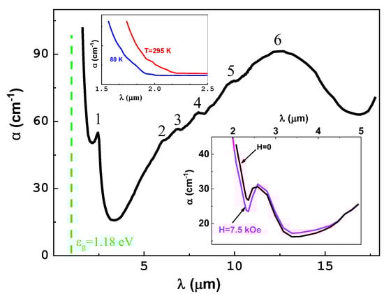 At λ1 = 2.6 µm (0.48 eV), the spectrum exhibited band 1, which was also presented in the spectra of σopt (Figure 4b) and was conditioned by the impurity absorption. In [30], it was established that oxygen surrounding the ions Co2+ and Fe3+ endures octahedral distortions, stronger in the case of Co2+. We suppose that band 1 can be formed by transitions from the valence band to the states VO (oxygen vacancy) +3d(Fe3+) and VO+3d(Co2+), similar to the impurity absorption in single crystal of Hg(Cd)Cr2Se4 [31]. On decreasing temperature, the intensity of band 1 also decreased (left inset in Figure 5), which was related to the temperature-induced shift of the absorption edge. In the wavelength range 3 < λ < 15 µm, the absorption spectrum exhibited a broad band with a maximum at λ6 = 12.5 µm (0.1 eV) and a fine structure consisting of small bands centered at λ2 = 6.1 µm (0.2 eV), λ3 = 7 µm (0.17eV), λ4 = 8.4 µm (0.14 eV) and λ5 = 10 µm (0.12 eV) (Figure 5). Cooling CoFe2O4 crystals to T = 80 K resulted in better resolution of the fine structure (data not shown). The positions of these bands are close to those of the impurity bands, which were observed in the spectrum of CoFe2O4 crystals doped by ions of Zn, Zr or Cd [26]. The increase in the absorption at λ > 15 µm was attributed to the phonon spectrum.
