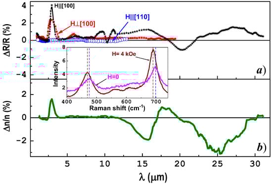 As shown in Figure 6, the spectral shape and the value of magnetoreflection essentially depend on orientation of magnetic field relative to the crystallographic axes. In the range λ < 1.5 µm, the dependence ΔR/R(λ) demonstrates a growth connected with the shift of the fundamental absorption edge under the action of the field independently of its direction. An intense band ΔR/R at λ~2.9 µm, weak bands at λ~6 µm and a feature at λ~ 10–12 µm arise due to changes in the intensity and position of the impurity-absorption bands (Figure 6a). At H||[100], the value of ΔR/R was almost twice as high as at H⊥[100] and can reach ~4%. In the case of H||[110], magnetoreflection tends to zero within the accuracy of experiments. Features of ΔR/R at λ > 16 µm were ascribed to the impact of magnetic field on the phonon spectrum. More distinctly they are pronounced in the changes of Raman spectra for the CoFe2O4 single crystal under application of an external magnetic field (inset in Figure 6). This is a direct evidence of a close interplay of phonon and magnetic subsystems, which was earlier observed in [33].