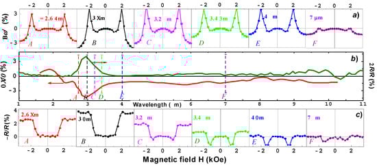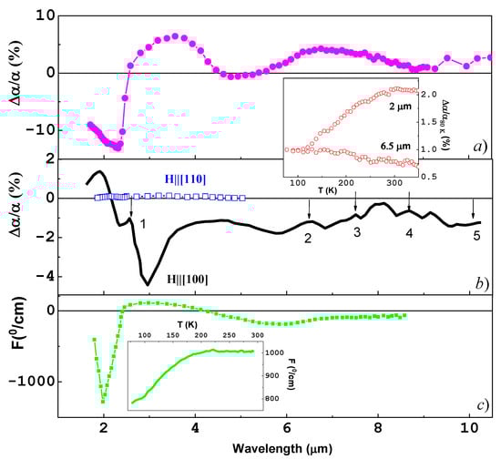 Unlike in the Faraday configuration, in the Voigt configuration the positions of impurity-absorption bands are well distinguished and are shown by arrays (Figure 7b). In accordance with (7), the values of Δα/α and ΔR/R essentially depend on the field direction relative to the crystallographic axes. In the case of H||[100], the magnetoabsorption reaches its maximal values, for instance, at room temperature Δα/α~5% at λ~2.9 µm. Upon cooling to 80 K, the value of Δα/α is enhanced to 12%. However, in the case H||[110], the values of Δα/α and ΔR/R were almost close to zero (Figure 6a and Figure 7b). Thus, in the magnetostrictive spinel CoFe2O4, the shape of the Δα/α and ΔR/R spectra was controlled by the angle between axis [100] and magnetization direction.