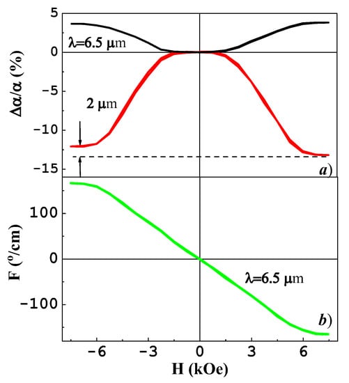 It is important that the asymmetry of Δα/α(H) corresponds to the sign of F. The estimation of the F values at room temperature, accounting for Malus’s law and partial polarization of light P in the optical setup (P ≈ 0.1), gives F ≈ −450 °/cm, +150 °/cm, and −400 °/cm at λ = 2.3 µm, 3.3 µm and 6.5 µm, respectively, in the saturation field H = 6.5 kOe. Thus, the estimated contribution of the Faraday effect to the magnetoabsorption did not exceed 1/6 of the experimental value of Δα/α.