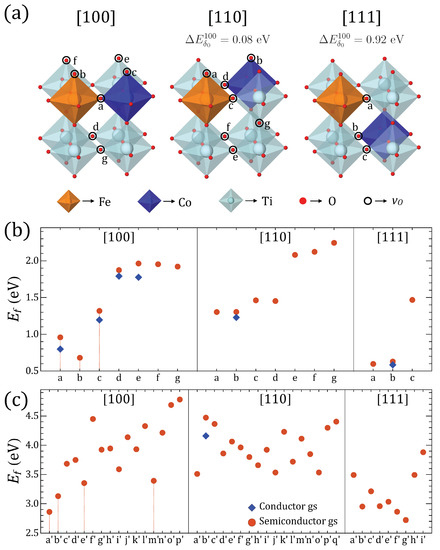 Considering the results of Figure 1, a preference for the to be coordinated by [100]- and [111]-oriented Fe–Co pairs is observed, as Ti–Ti coordinated vacancies tend to have significantly higher . This is consistent with the preference for at least one O uncompleted octahedral site hosting Co and Fe ions, reducing the number of configurations to be analysed. However, the total energy differences between configurations with [100]-oriented Co–Fe and the other two orientations for and deficiencies is at least ∼ 0.6 eV and ∼ 0.7 eV, respectively, when comparing [100] and [110], with even larger differences for [111]. Moreover, the energy differences between Fe–Co pairs favor [100]-configurations by ∼0.1 vs. [110] and ∼0.9 eV vs. [111], as Figure 1a shows.
