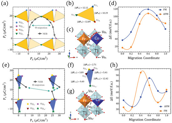 Symmetry-equivalent configurations lead to symmetric barriers, whereas migrations connecting energetically different configurations are represented by asymmetric barriers as seen in Figure 2, Figure A5, Figure A6, Figure A7, Figure A8, Figure A9 and Figure A10, which resemble, for example, oxygen diffusion along different O-defined NaBiTiO planes [73]. In our case, for instance, symmetric have the z–y plane defining as does not change in that rotation, but the local magnetic moments do not change either because neither Fe nor Co coordinations are being modified (Figure A7). The migration barriers for symmetric cases are in general comparable or even larger than nonsymmetric ones, and in the process of tuning the ferroelectric and/or magnetic order parameters, energetically different are most likely to be involved in an oxygen-driven structural accommodation, which leaves us with the migrations to/from or if we restrict for sake of comparison to approximated to the separation between the lowest and the second-lowest GS. We display in Figure 2a the continuous polarization footprint of a system in which an oxygen moves from the Fe–O–Co position to the in and back to the in along the path illustrated in Figure 2c. Moreover, in Figure A8 the results for migration between a and b are shown.