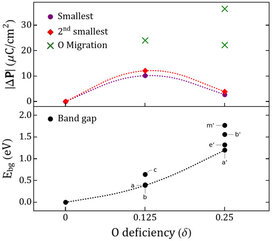 The polarization changes have been discussed in terms of oxygen diffusion, which may be controlled electrochemically (e.g., by ionic liquid gating or oxygen pumping), or it may be driven by temperature fluctuations or strain effects. This provides the possibility of direct control over the polarizability of such materials post-growth, as well as via the oxygen pressure during growth. In Figure 3 we show that although the centrosymmetric stoichiometric solutions do not predict a switchable polarization, increasing the deficiency of the perovskite yields polarization changes that are larger for and decrease for . However, in both cases a migration mechanism can improve upon such a value, providing us with at least twice the initial response for one and up to ∼4–6 times for two . The largest attainable, according to our calculations, likely requires vacancy migration. This mechanism has been widely studied in solid perovskite fuel cells, perovskite-based capacitors, solid electrolytes and all-oxide electronics [74,75]; however, its use in multiferroics as a mechanism to assist ferroic-order is unexplored.