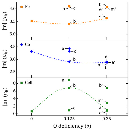 We comprehensively analyzed the magnetic/electric order parameters of the three lowest-energy GSs of O-deficient structures with the [100] Fe–Co arrangement and as pointed out in Figure 1 (vertical lines). In the case of the same cation arrangement for , we analyzed the three lowest GSs plus a fourth GS that is energetically closest to the other three states, as also depicted in Figure 1. The structural and magnetic properties of these perovskites are described in Table 1. The system relaxes to FM ordering in the global GS with spin gaps below ∼20 meV of AFM orderings in P1 and P4/mmm symmetries for and , respectively. P1 has the lowest symmetry due to the oriented perpendicular to the Fe–Co alignment, which is responsible for the larger unit cell (UC) volume with respect to P4/mmm. The Fe and Co ions are stable as high spin states for and , and the magnetic moment/UC slightly increases from to , as both Fe and Co are sandwiched by a vacancies in . The band gap also increases significantly for any compared to any solution. FM and AFM orderings compete among GS solutions depending on the number and location of with respect to the Fe–Co pair. These results are in partial agreement with hybrid calculations [4,5,34].