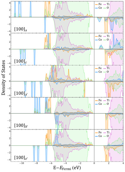 The symmetry of the charge density suggests that the creation of the oxygen vacancy has promoted a subtle charge redistribution that is more evident in the case of Co cations as they present a larger change of local charge. Fe and Co coordinations also show distinct characteristics beyond the ionic radii changes that are triggered by the 3d-2p hybridization of the TM at the Fe–O and Co–O centers, as also suggested by the projected density of states in Figure 5 and Figure A11. One of the signatures of the Fe and Co behavior can be seen in Figure 5. For Co, hybridization defines the acceptor-like states delimiting the band gap whereas half-filled Fe states form the Fermi limit of the valence band. For , the additional electrons partially occupy the acceptor states, increasing the gap and proving the propensity of Co to fill 3D orbitals under variations of charge, whereas Fe orbitals tends to reach high-spin states so that the closest empty state has always opposed polarization to the majority populated states. These features are useful ingredients for the generation of a material whose ferroic degrees of freedom do not exclude each other.