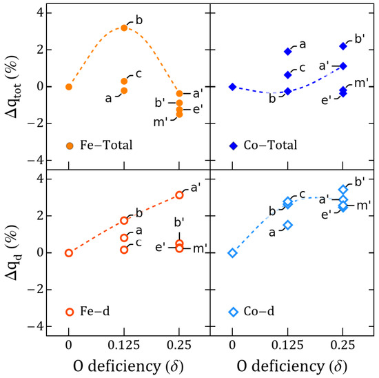 Total and d-orbital Fe/Co charge variation vs. with respect to perovskites. Values shown for and correspond to the lowest-energy semiconductor states of Table 1.