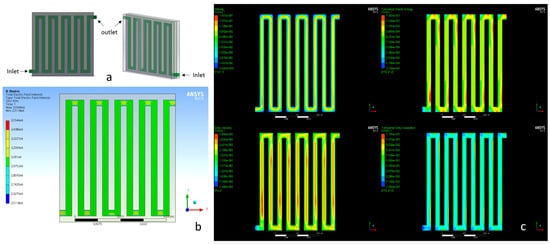 Using the same inlet velocity of the previous simulations (Figure 1c), the fluid flow was smoother as can be seen in Figure 2d. The turbulence kinetic energy was distributed more homogeneously and thus, cells did not stall at the turns of the device.