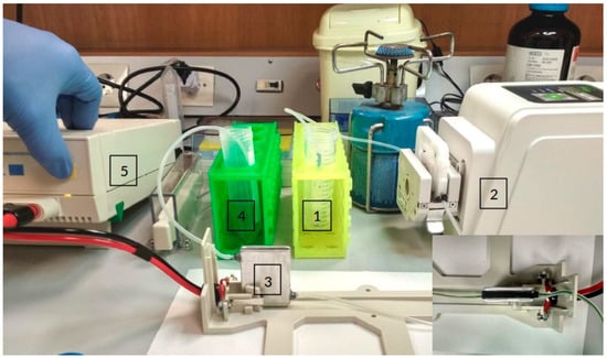 To realize the device, a plastic structure from ABS forming the above-mentioned chamber was 3D-printed and two aluminium plates were glued on both sides to form the electroporation chamber. Two silicon tubes with a diameter of 1 mm were attached to the inlet and outlet of the chamber in order to transfer the solution to be electroporated (Figure 1c). The complete apparatus is depicted in Figure 3.