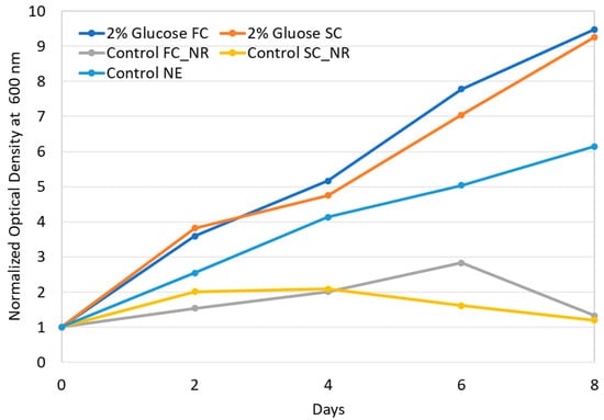After electroporation, cells deprived of their natural cell wall cannot survive if they are directly cultivated in normal media because of osmotic issues and of the fragility of their body. The efficiency of cell wall reconstitution and regeneration after protoplast preparation was studied in our previous works [20,21]. Based on our previous results, after electroporation, we cultivated S. almeriensis protoplast in a medium containing 2% glucose for 8 days. Every 2 days, we measure the optical density of the culture at 600 nm and used these values to construct growth curves. If cells were permanently damaged by the electroporation with the flow cuvette and not able to perform photosynthesis, the culture optical density would decrease day by day; on the contrary, an increase in culture optical density would indicate low or no cell death.