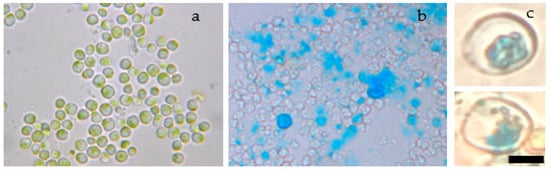 To verify the transfer of magnetic nanoparticles, Prussian blue staining was used to visualize them into the cytoplasm of microalgae cells (Figure 6a).