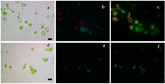 To verify the presence of fluorescent siRNA oligo inside S. almeriensis cells (Figure 7a,d), a fluorescent microscope was used. The nuclei of cells were counterstained using a Hoechst stain (Figure 7b,e). The successful introduction of siRNA inside S. almeriensis cells was confirmed by the green fluorescence (Figure 7c,f) generated by the fluorophore linked to the siRNA.