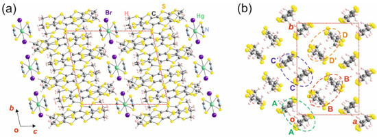 Low-temperature (80 K) crystal structure of κ-(BEDT-TTF)2Hg(SCN)2Br: (a) projection view along the a-direction; (b) BEDT-TTF donor layers showing the different dimers (AA’, BB’, etc.). For clarity, the disorder in half of the donor ethylidenedithio groups (i.e., those not facing the Br atoms) is not shown. The four dimers in the repeat unit of the layer are highlighted with different colors. Note that in the high-temperature structure, the repeat unit contains only two dimers, i.e., the AA’ dimer is identical to CC’ and the BB’ dimer is identical to DD’.