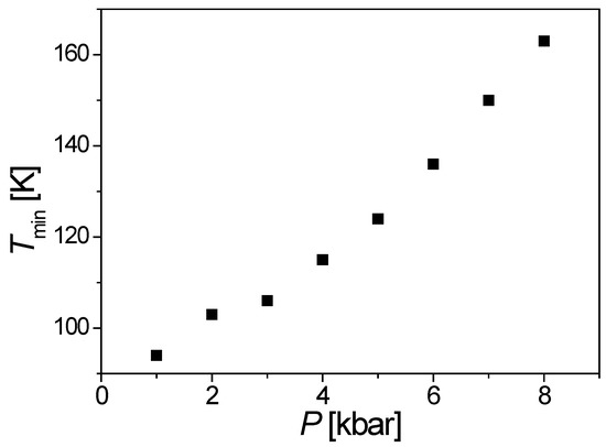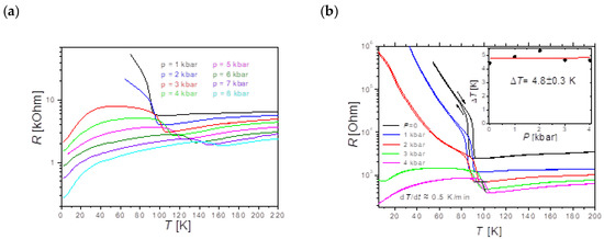 Figure 2a,b show the temperature dependences of the interlayer resistance in κ-(BEDT-TTF)2Hg(SCN)2Br at different pressures for two different samples. At ambient pressure and TMI ≈ 90 K, a pronounced metal–insulator transition is observed. It can be clearly seen (Figure 2b) that the transition occurs with a noticeable hysteresis with a width ΔT = (4.8 ± 0.3) K, which is almost pressure-independent. The onset of the transition, defined as the temperature of the minimum on the temperature dependence, shifts with increasing pressure toward high temperatures and does not disappear completely up to the maximum available pressure of p = 8 kbar. The dependence of the shift of the beginning of the transition with the pressure in the cooling mode is reported in Figure 3. At the same time, the increase in resistance upon cooling below the transition temperature is suppressed by pressure in such a way that even at a pressure of p = 3 kbar, the “metallic” behavior of the resistance at low temperatures is quite pronounced. A further increase in pressure enhances this behavior.