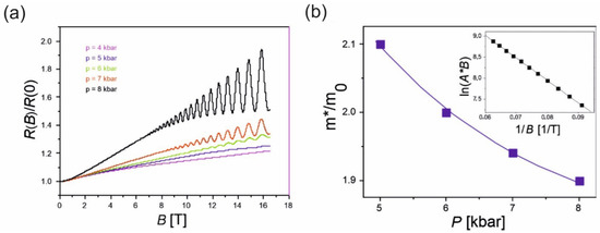 The oscillation frequency practically does not change with increasing pressure. An estimate of the cyclotron mass of the electrons associated with quantum oscillations at a pressure of 5 kbar gives a value of m* ≈ 2.1 m0 (m0 is the mass of a free electron), which decreases by approximately 10% as the pressure increases to 8 kbar (Figure 4b). Such behavior is typical in the vicinity of the M-I transition and could be due to the mass renormalization by many-body interactions [13]. The decrease could be due to an increase in the concentration of free carriers, and as a consequence a weakening of the electron correlations [13]. The field dependences of the oscillation amplitude in Dingle coordinates for two-dimensional systems (see the example in the inset in Figure 4b) makes it possible to calculate the Dingle temperature. In the present case, TD ≈ 1.5 K and does not change with pressure. This fact excludes the influence of a change in scattering under pressure over the amplitude of the magnetoresistance oscillations. In addition, a good agreement between the field dependence of the amplitude and the Lifshitz–Kosevich model (Figure 4b) indicates the absence, at least in our range of fields, of the contribution of the incoherent interlayer transfer to the oscillations [14].