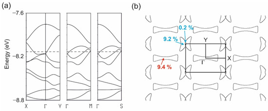 The calculated band structure for the donor lattice in the low-temperature structure of κ-(BEDT-TTF)2Hg(SCN)2Br is shown in Figure 5a. The eight bands are mostly built from the HOMO (highest occupied molecular orbital) of BEDT-TTF, and because of the stoichiometry, two of these bands should be empty. Since the second and third bands from the top overlap, the salt is predicted to be metallic below the phase transition (see below). The calculated Fermi surface (FS) is reported in Figure 5b and contains two contributions: first, elongated bone-like electron pockets with a cross-sectional area of 9.4% of the Brillouin zone (BZ); second, two boomerang-like hole pockets with a cross sectional area of 4.6% for each of them, which either touch or very slightly superpose at the M point. Strictly speaking, these two pockets very slightly interact, leading to a pocket with an area of 9.2% and another very small one at M with an area of 0.2%. However, as it is clear from Figure 5b (see lines Γ-M and Γ-S), a minute change in the structure could suppress the overlap and lead to a single hole pocket with an area of 9.4%. This FS can be described as resulting from the superposition and hybridization of a series of ellipses centered at the Y point. This is a surprising result because the FS of the κ-phases usually results from the superposition and hybridization of a series of pseudo-circles centered at the Γ point.