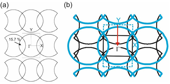 In order to understand this unusual shape, we also calculated the FS for the high-temperature structure (see Figure 6a). This FS is the expected one for the κ-phase; it results from the superposition of a series of circles centered at the Γ point with a cross-sectional area of 100% of the BZ. Because of the superposition, closed pockets with a cross-section of 15.7% around the X point are generated. Note that the a- and c-directions are interchanged with respect to those in the low-temperature structure, but we keep the same labelling for the high- and low-temperature structures in order to facilitate the comparison. The FSs for the donor layers of the high- (Figure 6a) and low-temperature (Figure 5b) structures can be easily related if it is taken into account that the b parameter of the crystal structure practically doubles when going from the high- to the low-temperature structures. Thus, the FS of the low-temperature structure should simply result from a folding of the high-temperature one. This process is schematically illustrated in Figure 6b. The FS of the high-temperature structure and the BZ are shown in blue. Because the new BZ of the low-temperature structure is only half the size, half of the high-temperature FS must be translated within the new smaller BZ. Since the b parameter doubles, the folding must be carried out along the b*-direction and consequently the Y point of the original BZ is translated into the Γ point of the new BZ, as schematized by the red arrow in Figure 6b, and the black lines are generated. In that way, the approximate FS of the low-temperature structure is generated (i.e., the black and blue lines of Figure 6b). Finally, because of the lack of symmetry (except for the trivial symmetry of the inversion center), small gaps are opened at the crossing points and the FS of Figure 5b is generated. Thus, because of the doubling of the repeat unit of the donor layers as a result of the dimer differentiation, the FS changes from a superposition of circles to a superposition of ellipses and finally contains closed orbits differing in area and nature before and after the transition.