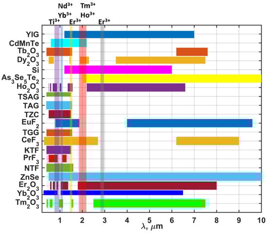 Transmission spectra of magneto-optical materials. Arranged in descending order of the Verdet constant value from top to bottom. Translucent vertical stripes indicate the characteristic spectral regions in which lasers based on the specified above ion can generate radiation.