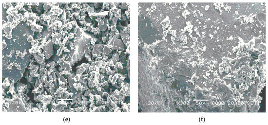 A scanning electron microscope (SEM) of uncoated MNPs and all the fatty-acid-coated MNPs are shown in Figure 4a–f. Figure 4a,b shows the SEM micrographs of uncoated MNPs, which are highly aggregated. Figure 4c shows a SEM micrograph of lauric-acid-coated MNPs, Figure 4d shows oleic acid-coated MNPs, Figure 4e shows a SEM micrograph of linoleic-acid-coated MNPs, and Figure 4d shows a SEM micrograph of linolenic-acid-coated MNPs. The size of all the particles is 10–30 nm, but due to aggregation and their very small size, they exhibit large lumps. The particles are highly aggregated as shown in the images. Several investigators have also reported a similar morphology of the synthesized MNPs, such as Yadav and Fulekar (2018), [22] and Yadav et al. 2020 [15]. The authors have obtained a range of sizes, i.e., 20 nm to 120 nm, by the chemical co-precipitation method [22]. Besides this, Pandya et al. 2018 also obtained similar results for synthesized MNPs using the chemical co-precipitation method. The particle size distribution was around 20–100 nm. It was polydispersed in nature, and as the unsaturation increased, particle size decreased.