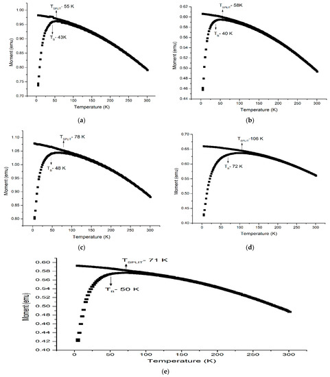 MNPs at room temperature show superparamagnetic behavior, i.e., no hysteresis loop. However, a hysteresis loop can be achieved by pinning magnetic domain walls at grain boundaries within the material and by that material becoming ferromagnetic [30]. If synthesized NPs are of a size below a superparamagnetic critical size. In that case, hysteresis behavior vanishes above the blocking temperature. The magnetic behavior of MNPs was studied using VSM, ZFC and FC curves in the presence of the external field of 500 Oe. Increasing the temperature up to 300 K, as presented in Figure 7a–e, shows that these uncoated MNPs and surfactant-coated MNPs exhibit a superparamagnetic nature [31,32,33,34]