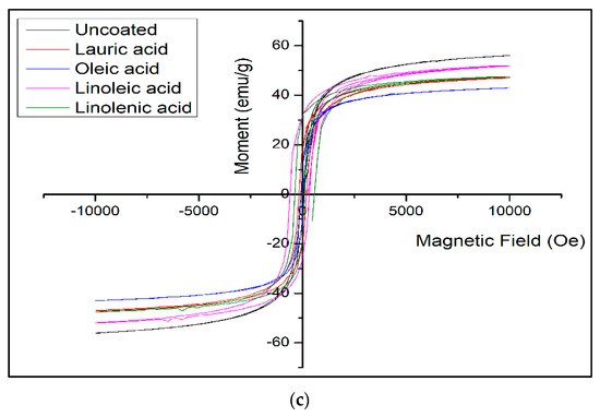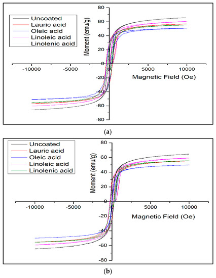 The increase in blocking temperature with an increase in the unsaturation of the surfactant may be understood as the particle size decreasing the thickness of the double layer and subsequently increasing, making the effective size of the surfactant–magnetite hybrid bigger. This may indicate that the average distance between magnetite nanoparticles does not change significantly. It seems that the double layering took place on the surface of some already agglomerated magnetite nanoparticles and not on all the individual magnetite nanoparticles. From Figure 7a, we can see the loss of magnetization with the increase in temperature over 200 K is very sharp for uncoated MNPs in comparison with the bilayer-coated MNPs, which are very smooth and slow. It can be understood that the bilayer of the surface of the magnetite acts as a shielding layer for the heat transfer to the inner magnetite, therefore reducing the rate of decreased magnetization.