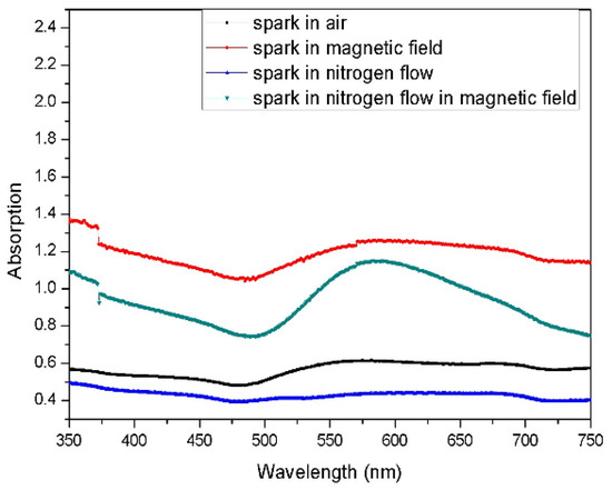 Effect of gas composition on noble metal nanostructure morphology and composition was already observed [16]. Gold was synthesised with sparking discharge for visible plasmonics [17]; however, substrates were annealed to up to 950 degrees Celsius to obtain broad extinction peaks. In our research findings, we obtain an ideal condition for preparation of plasmonic thin films without annealing, namely during nitrogen flow, while sparking under the magnetic field can obtain dispersed and equally shaped gold nanoparticles.