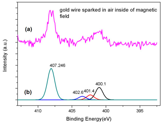 Additionally, we examined binding energy of nitrogen 1s, since we noticed that nitrogen plays a role in concentration of gold in thin films. Figure 5 and Figure 6 show the X-ray photoemission spectra of the N1s core levels for samples prepared in air inside of the magnetic field and gold wire sparked in nitrogen flow only. We found a lack of nitrogen in samples prepared in nitrogen flow with the presence of a magnetic field and samples prepared in ambient air, which maybe can be explained by a decrease in nitrogen reactivity. Samples exhibit peaks at binding energies of N1s core level spectra at 399.9 eV for a sample prepared in nitrogen flow and 400.1, 401.4, and 402.6 eV for samples prepared in air inside of a magnetic field, where these peaks are a characteristic of N2, oxynitrides or carbonitrides encapsulated in thin films [14] or nitride of silicon oxide (quartz). Furthermore, the presence of 407.1 eV and 407.2 eV peak in these two samples tells, us that during sparking discharge, NOx species were created that came into reaction with gold forming nitrates.