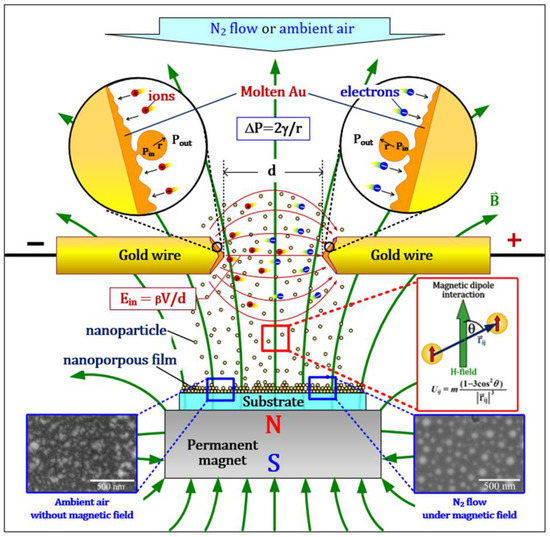 where θ is the angle made by the radial position vector connecting the two dipoles in the direction of the magnetic field; the parameter m has the unit of energy kBT0. The minimum condition for chain-like aggregate formation is if the repulsive part of the potential is larger than the thermal energy (kBT), such that a primary particle approaching another particle along a direction perpendicular (θ = 90°) to the magnetic field is successfully deterred. However, in our case we observed the formation of a single nanoparticle without agglomeration if the sample was prepared in a magnetic field under nitrogen flow, which leads us to believe that particles were repulsive no matter what direction to the magnetic field the primary particle was moving. Gold in the bulk state is diamagnetic; however, it was already observed that gold evaporated and collected in an inert atmosphere on substrate exhibits ferrimagnetic behaviour [21]; since our setup also utilised metal evaporation [22], as in Figure 8, and it was conducted under so-called inert gas, there was no nitrate formation visible in XPS, and oxygen could not react with the surface of the particle, so that can influence magnetization. It is possible that we obtained paramagnetic primary particles (in high temperatures, for ex metal melt) that form separate nanoparticle clusters, as seen in SEM image (Figure 3D).