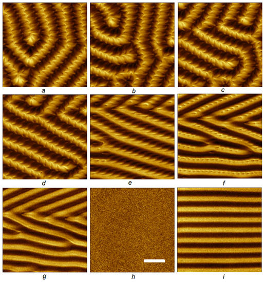 Figure 1 shows a series of MFM images obtained by remagnetization of the film in an in-plane magnetic field. More details can be found in the movie (see the movie S1––––– in Supplementary Materials). In this experiment, the film orientation was chosen in such a way that initially the domains in the scanning area were oriented at an angle to the direction of the external field (oriented horizontally in the figure). One can see a biperiodic domain structure with a fundamental period of about 4 m and a modulation period of 1.6 m. As the magnetic field increases, the stripe domains turn (Figure 1a–c), and the character of the longitudinal modulation (Figure 1d–f) changes. Further, the longitudinal modulation first disappears (Figure 1g), and then, the strip domain structure itself (Figure 1h), so the film turns into the saturated state. If we now slightly reduce the external field, the domain structure appears again, while already oriented in the direction of the applied magnetic field (Figure 1i).